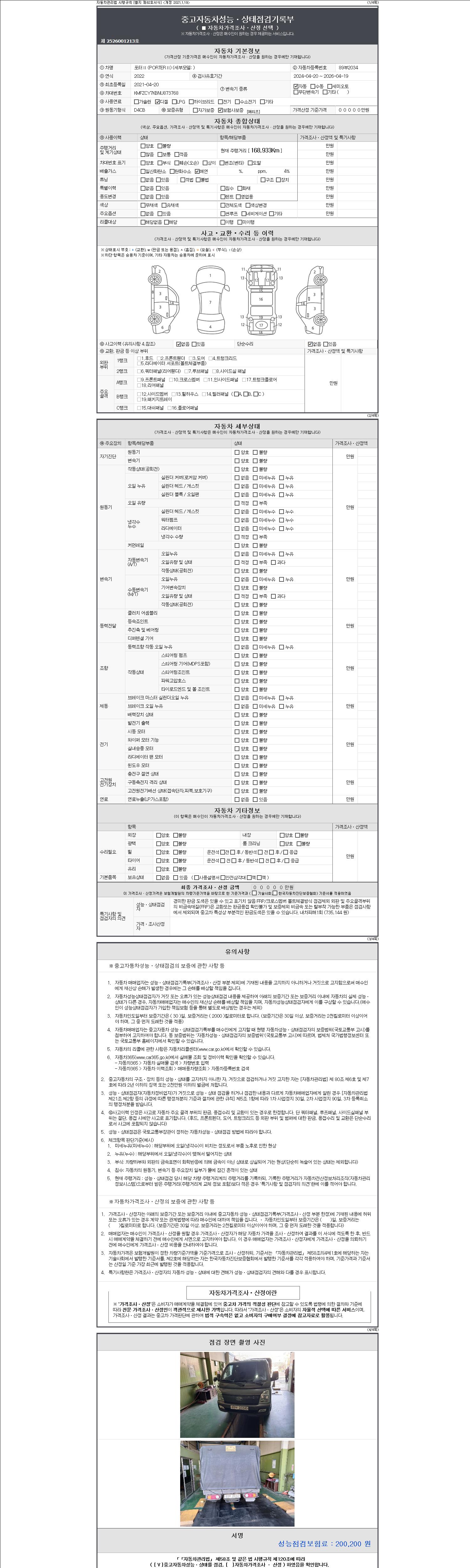 | 주행거리 | 168,933 km | 차량번호 | 89부2034 | 사고유무 | 성능기록부 참조 | 제시번호 | 제 2147483647 호 |