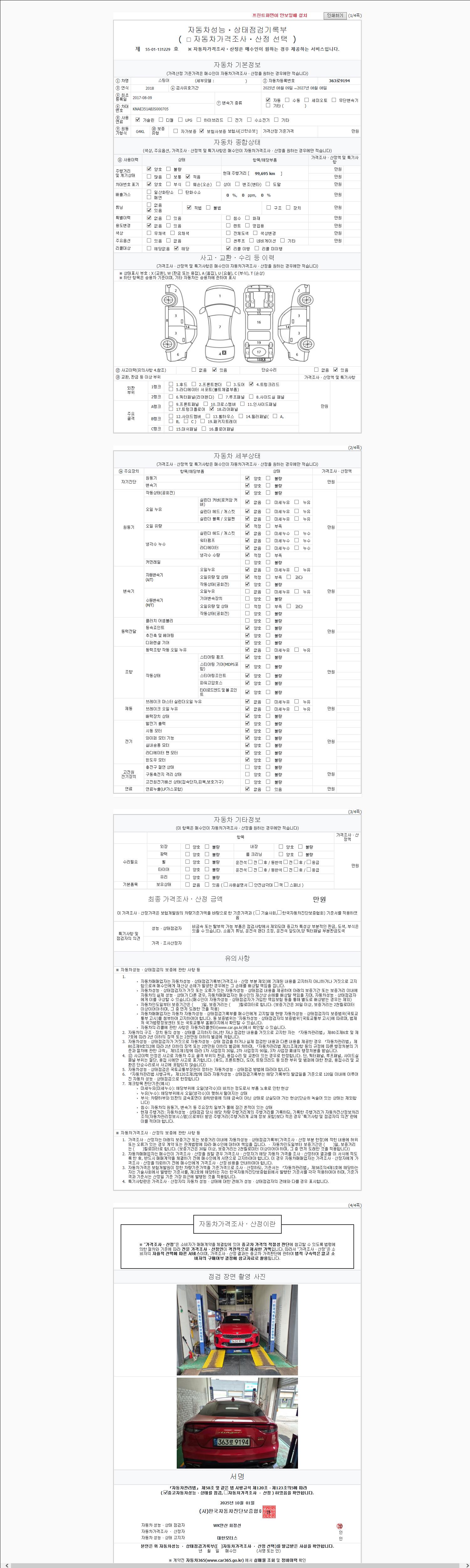 | 주행거리 | 99,695 km | 차량번호 | 363로9194 | 사고유무 | 성능기록부 참조 | 제시번호 | 제 2147483647 호 |