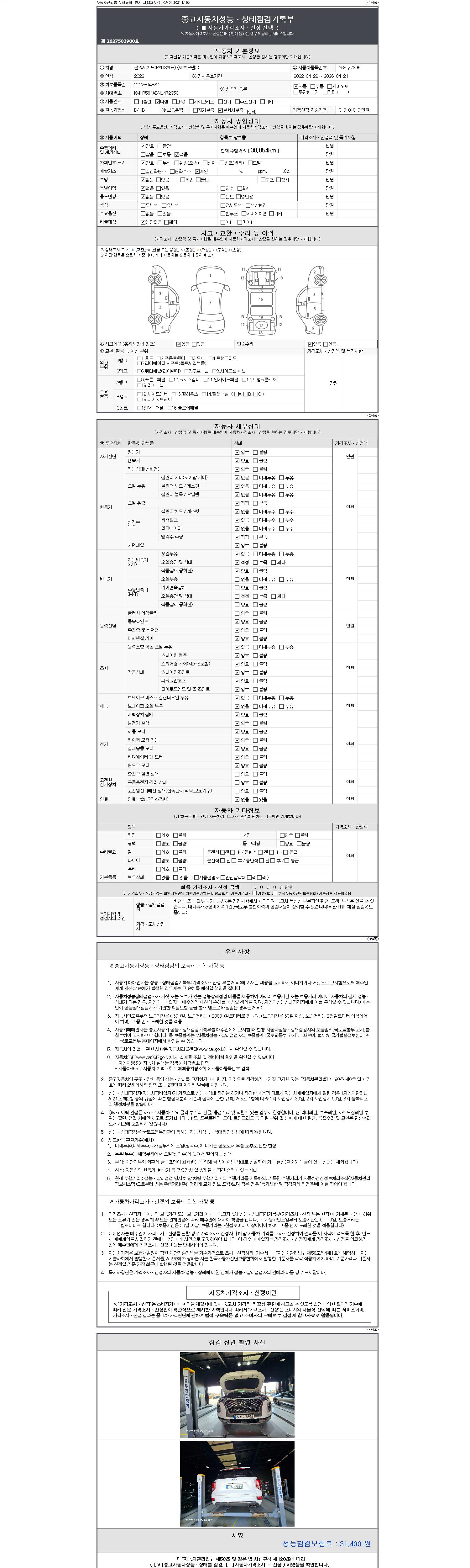 | 주행거리 | 38,846 km | 차량번호 | 365구7896 | 사고유무 | 성능기록부 참조 | 제시번호 | 제 2147483647 호 |
