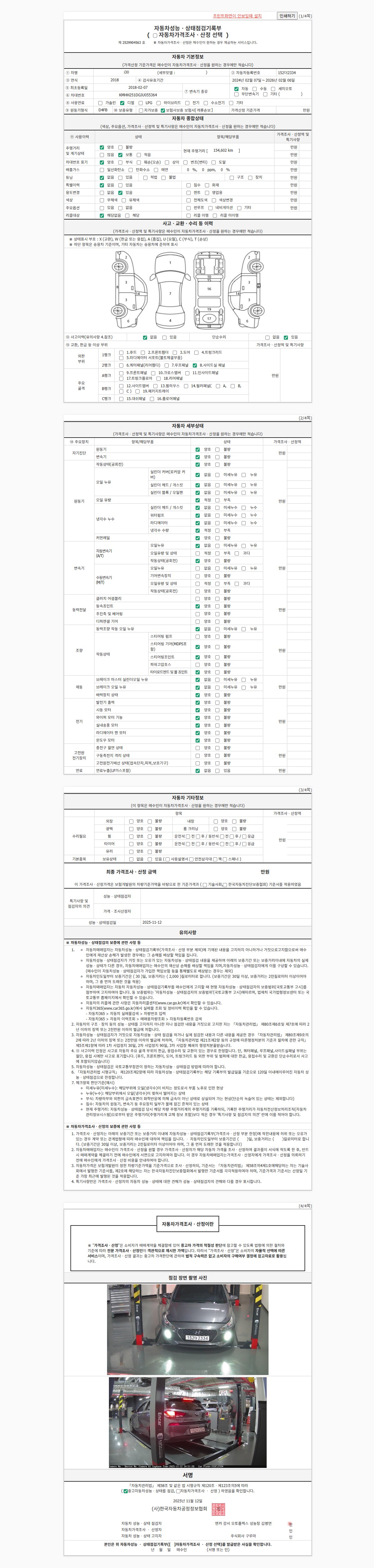 | 주행거리 | 154,602 km | 차량번호 | 152더2334 | 사고유무 | 성능기록부 참조 | 제시번호 | 제 2025152971 호 |