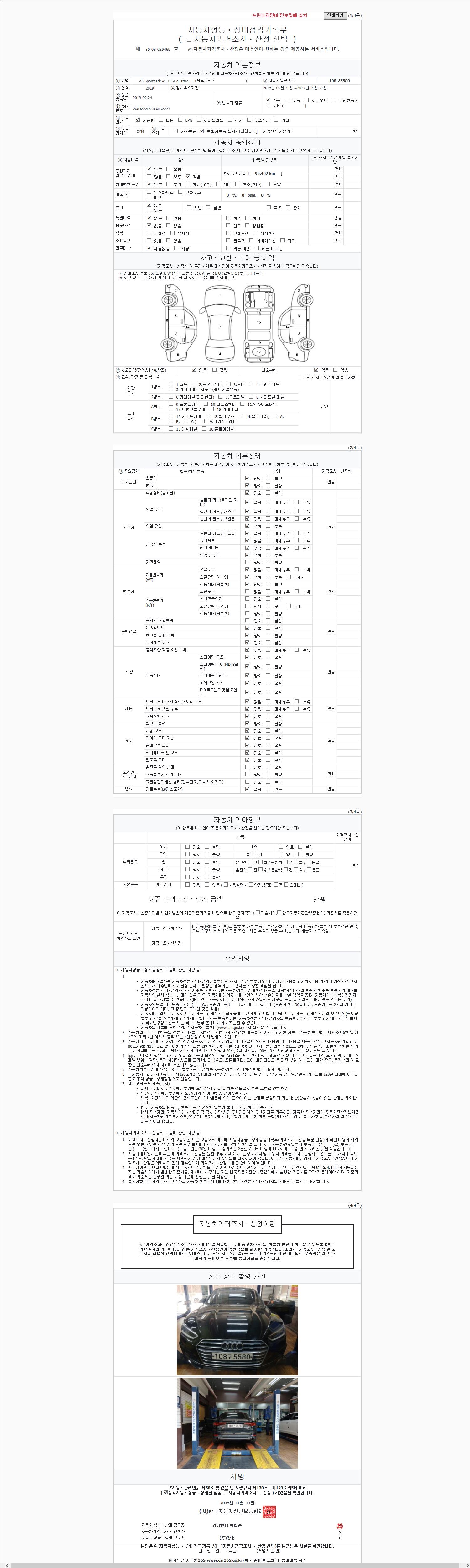 | 주행거리 | 95,402 km | 차량번호 | 108구5580 | 사고유무 | 성능기록부 참조 | 제시번호 | 제 2025155629 호 |