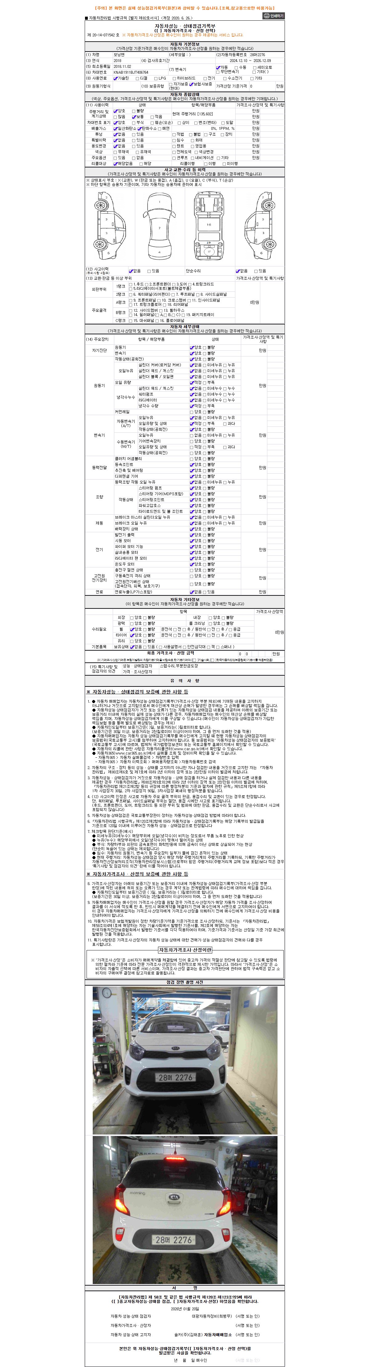 자동차관리법 시행규칙 제120조의 규정에 따라 별지 제 82호서식 《중고자동차 성능, 상태점검 기록부》를 발행한 성능, 상태점검자 및 매매자는 아래의 보증기간 또는 보증거리 이내의 중고자동차, 성능점검 기록부에 기재된 내용과 자동차의 실제 성능, 상태가 다른 경우 계약 또는 관계법령에 따라 매수인에 대하여 책임을 집니다.