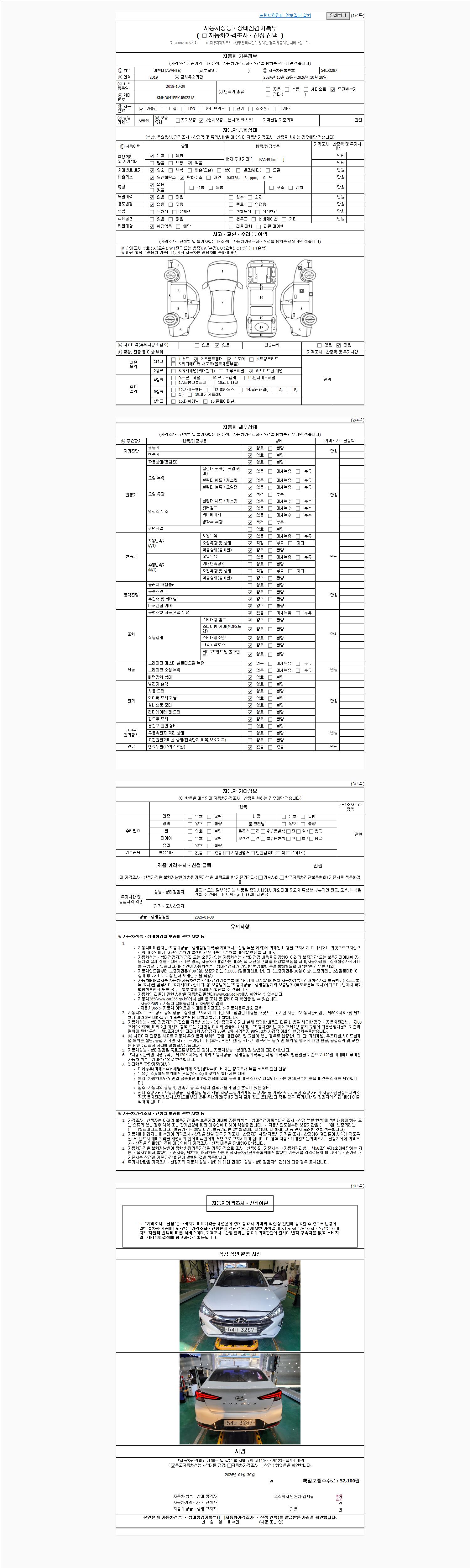 | 주행거리 | 97,139 km | 차량번호 | 54나3287 | 사고유무 | 성능기록부 참조 | 제시번호 | 제 2026005563 호 |