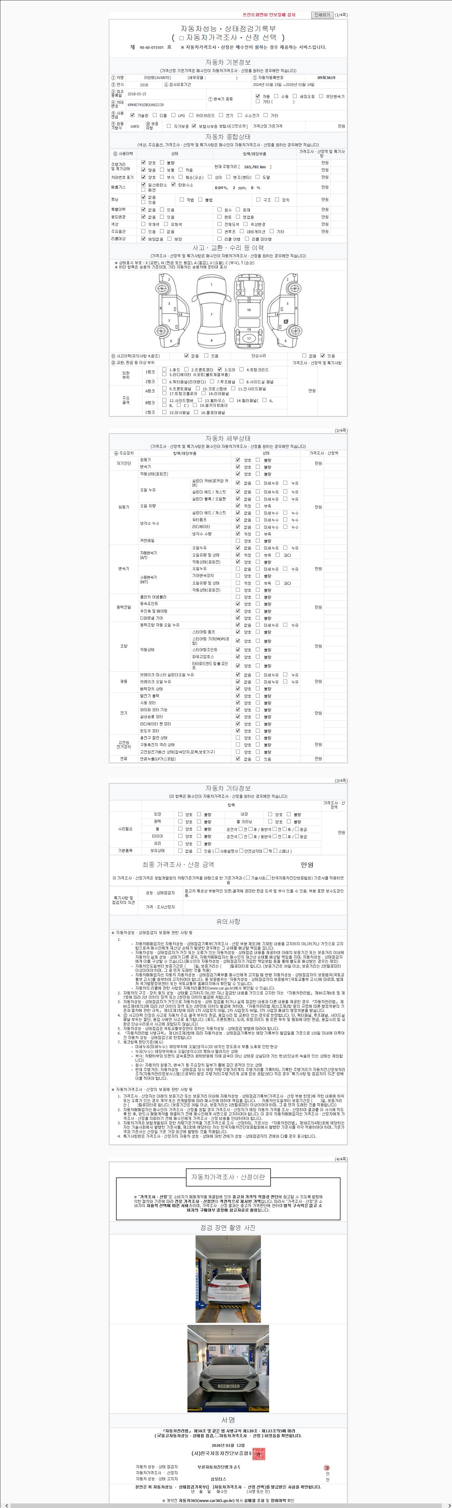 | 주행거리 | 165,781 km | 차량번호 | 09저3619 | 사고유무 | 성능기록부 참조 | 제시번호 | 제 2026029572 호 |
