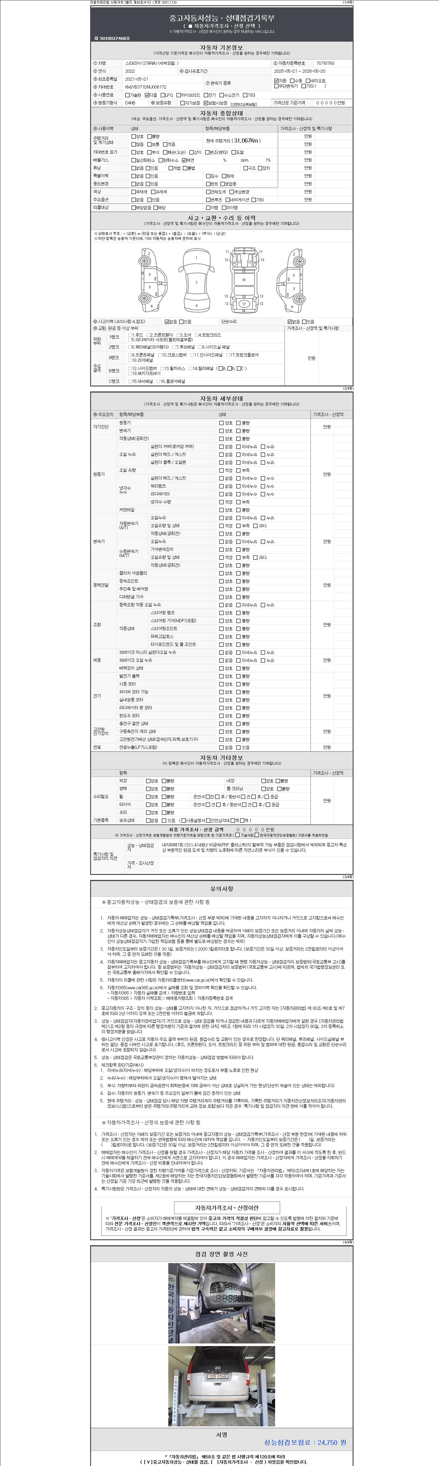 | 주행거리 | 31,067 km | 차량번호 | 70가0760 | 사고유무 | 성능기록부 참조 | 제시번호 | 제 2147483647 호 |