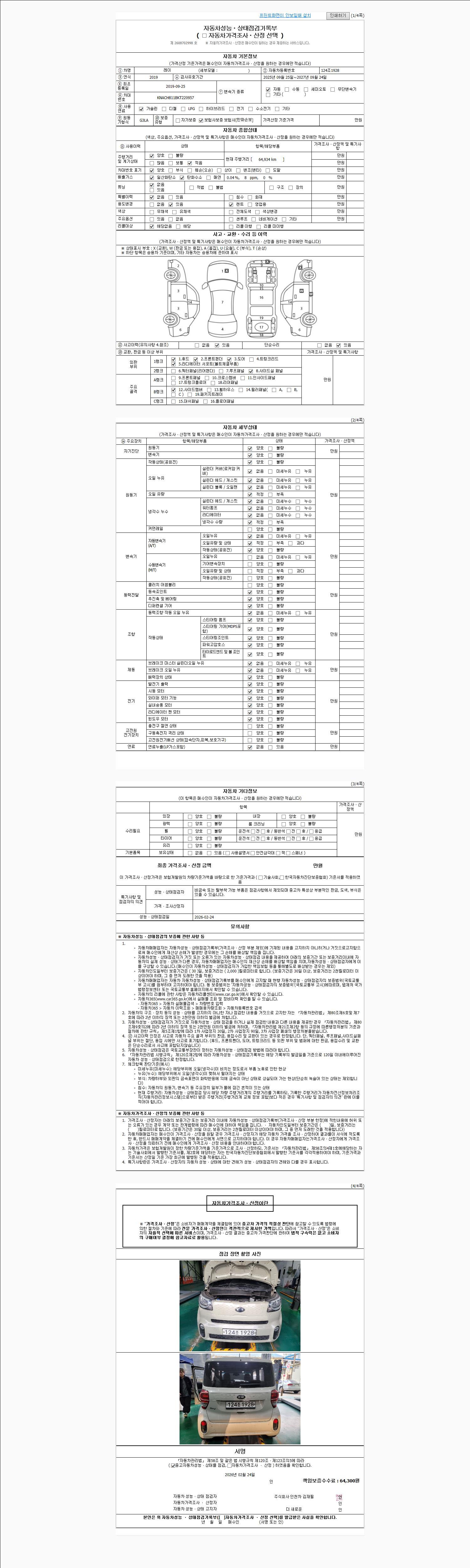 | 주행거리 | 64,934 km | 차량번호 | 124조1928 | 사고유무 | 성능기록부 참조 | 제시번호 | 제 2026009646 호 |