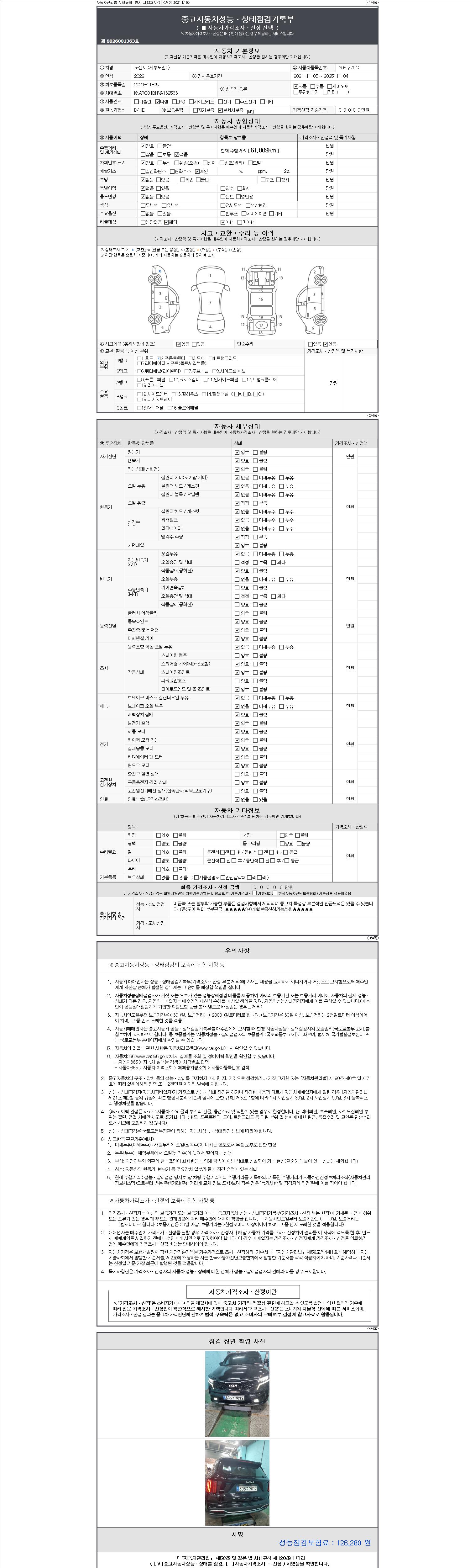 자동차관리법 시행규칙 제120조의 규정에 따라 별지 제 82호서식 《중고자동차 성능, 상태점검 기록부》를 발행한 성능, 상태점검자 및 매매자는 아래의 보증기간 또는 보증거리 이내의 중고자동차, 성능점검 기록부에 기재된 내용과 자동차의 실제 성능, 상태가 다른 경우 계약 또는 관계법령에 따라 매수인에 대하여 책임을 집니다.