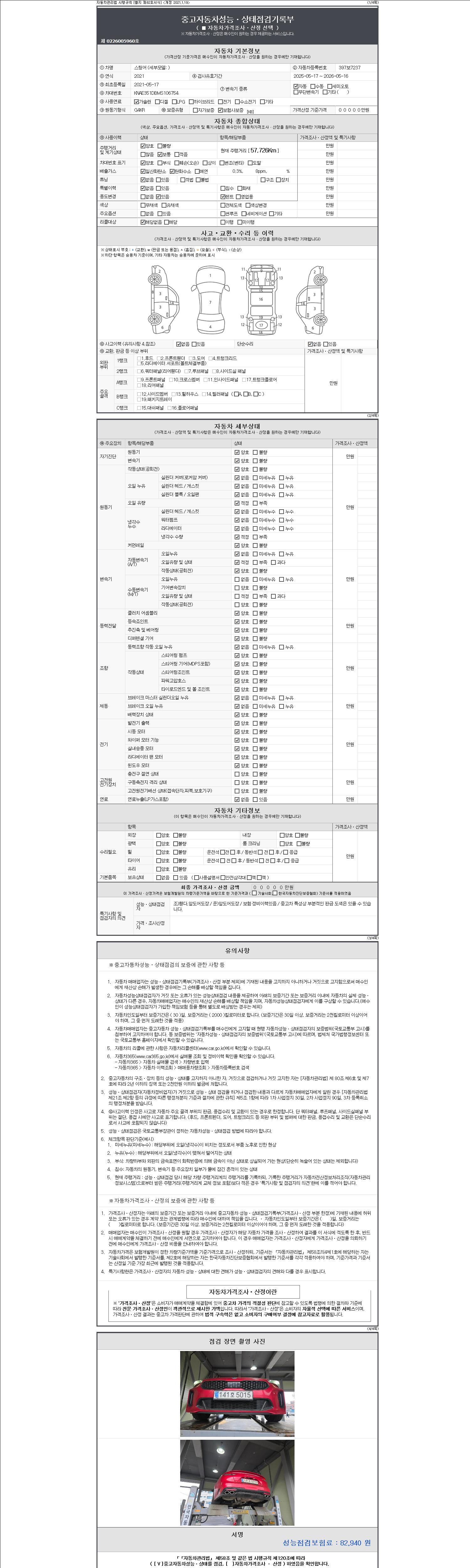 자동차관리법 시행규칙 제120조의 규정에 따라 별지 제 82호서식 《중고자동차 성능, 상태점검 기록부》를 발행한 성능, 상태점검자 및 매매자는 아래의 보증기간 또는 보증거리 이내의 중고자동차, 성능점검 기록부에 기재된 내용과 자동차의 실제 성능, 상태가 다른 경우 계약 또는 관계법령에 따라 매수인에 대하여 책임을 집니다.