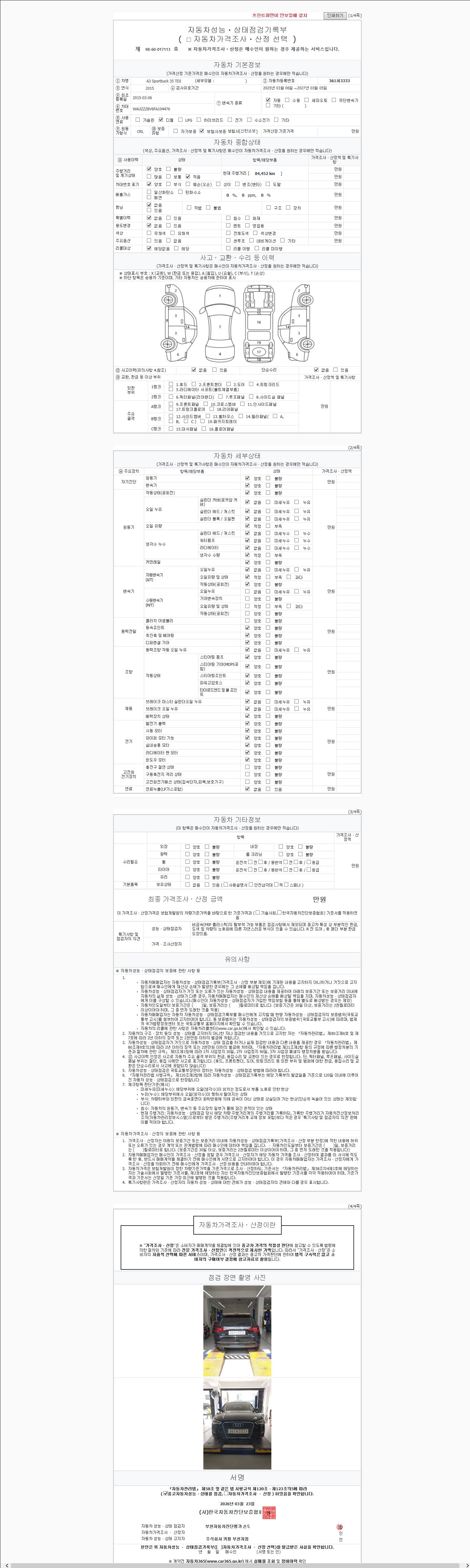 -중고자동차 매매업자를 통해 차량을 구입하실 경우 반드시 "중고자동차 성능, 상태점검 기록부"를 교뷰 받으셔야 하며, 매매업자는 반드시 의무 교부 하여야 압니다.