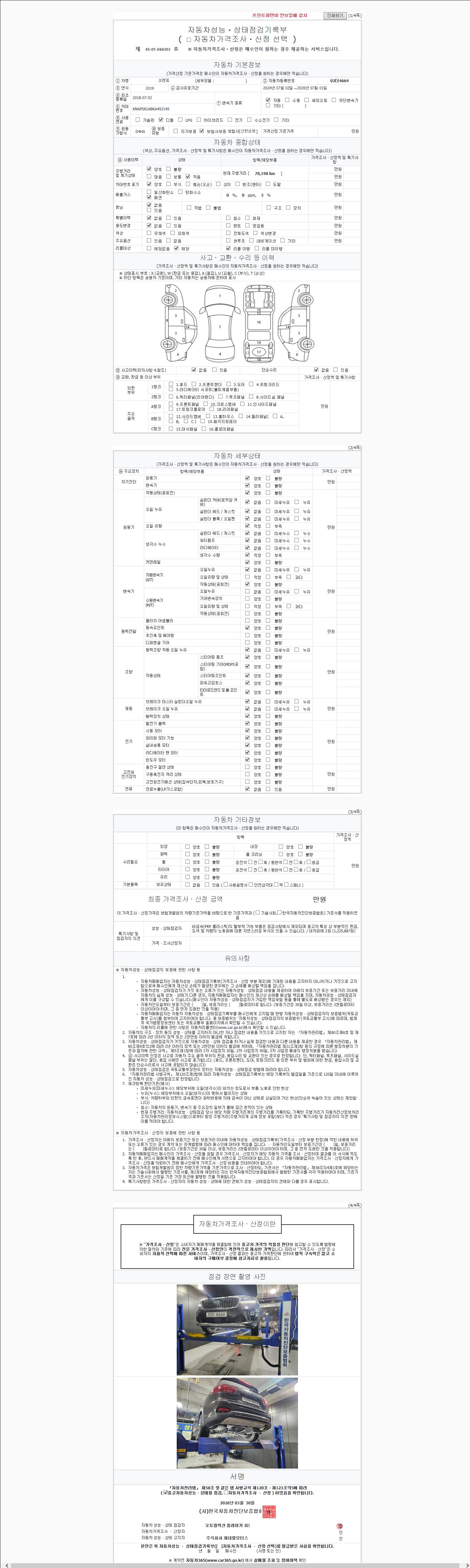 | 주행거리 | 78,198 km | 차량번호 | 02더4664 | 사고유무 | 성능기록부 참조 | 제시번호 | 제 2147483647 호 |