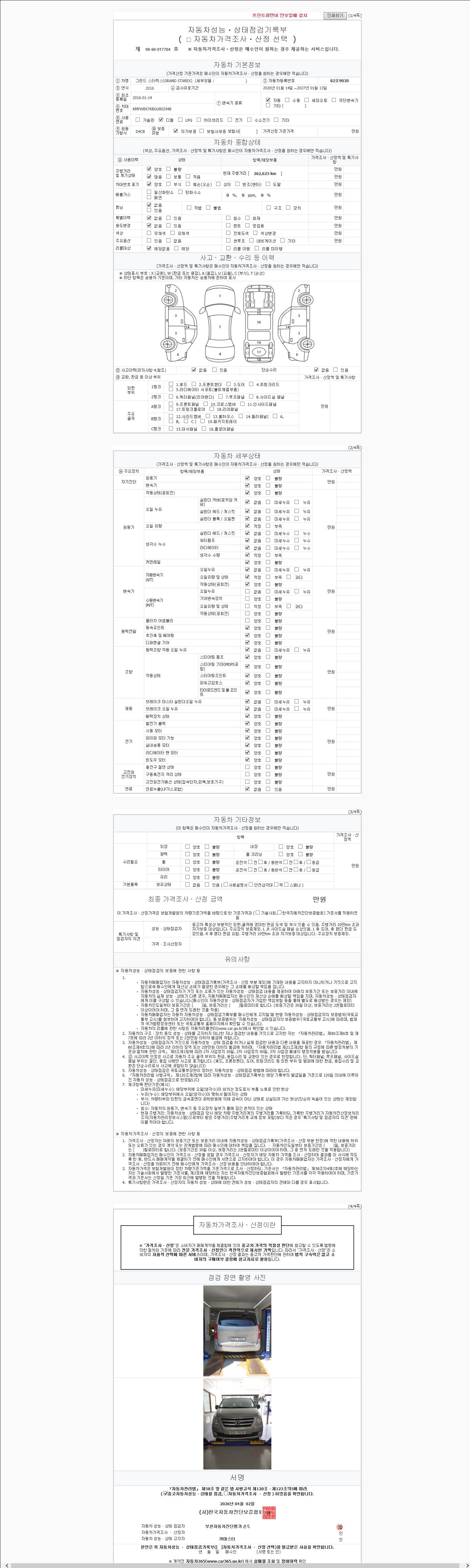 | 주행거리 | 262,623 km | 차량번호 | 82오9030 | 사고유무 | 성능기록부 참조 | 제시번호 | 제 2026017276 호 |