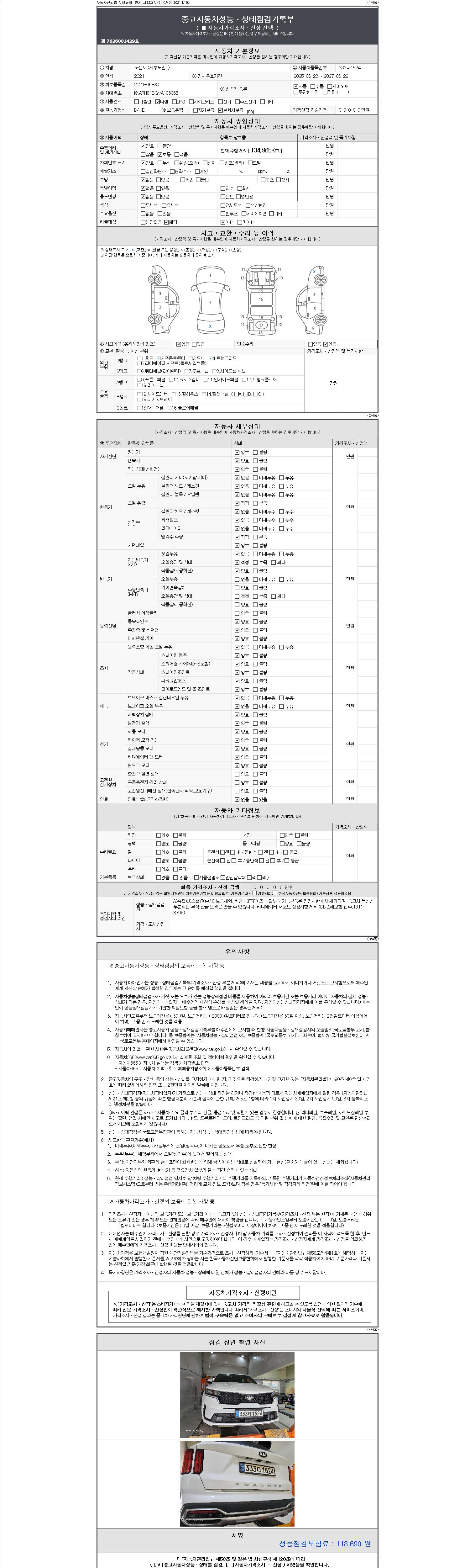 | 주행거리 | 134,965 km | 차량번호 | 333더1524 | 사고유무 | 성능기록부 참조 | 제시번호 | 제 2147483647 호 |