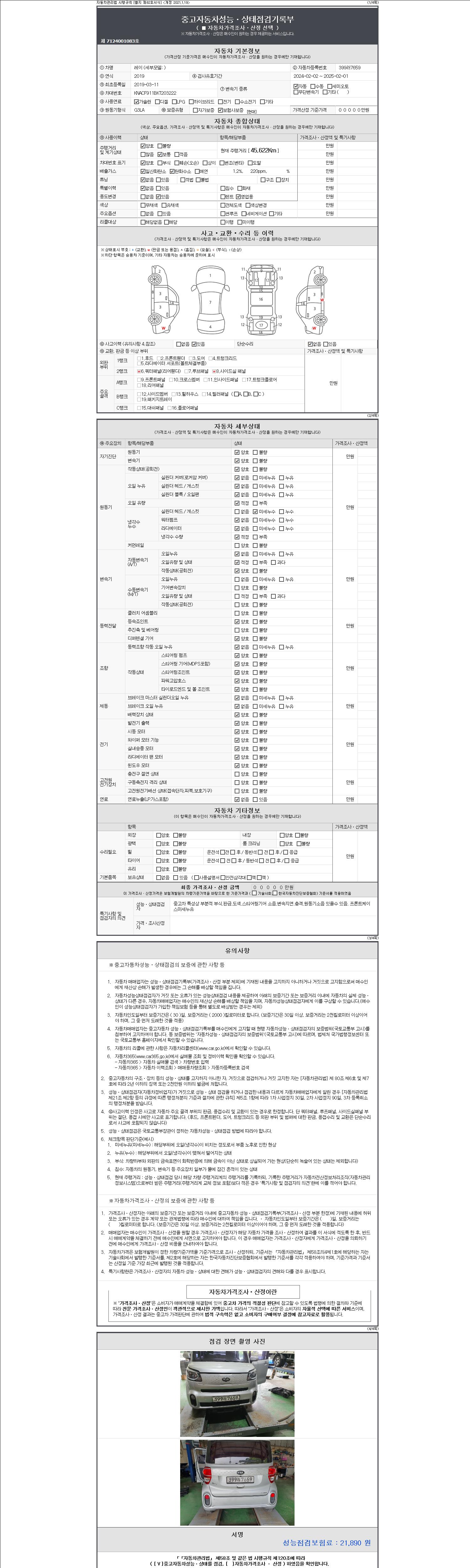 | 주행거리 | 45,622 km | 차량번호 | 399러7659 | 사고유무 | 성능기록부 참조 | 제시번호 | 제 2147483647 호 |
