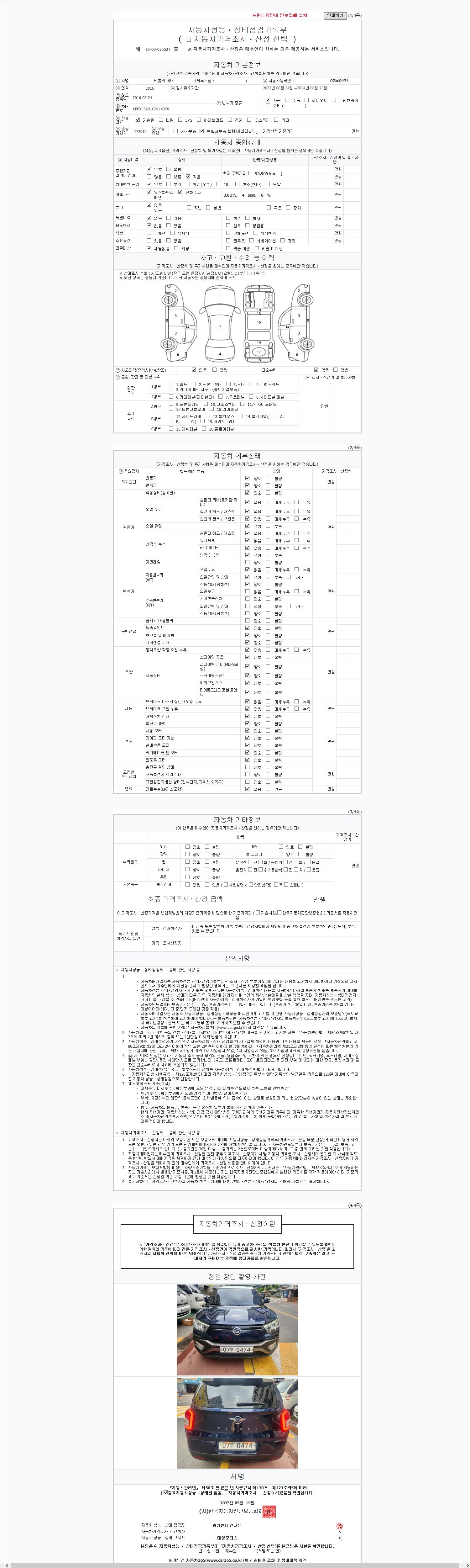 | 주행거리 | 95,905 km | 차량번호 | 07무0474 | 사고유무 | 성능기록부 참조 | 제시번호 | 제 2147483647 호 |