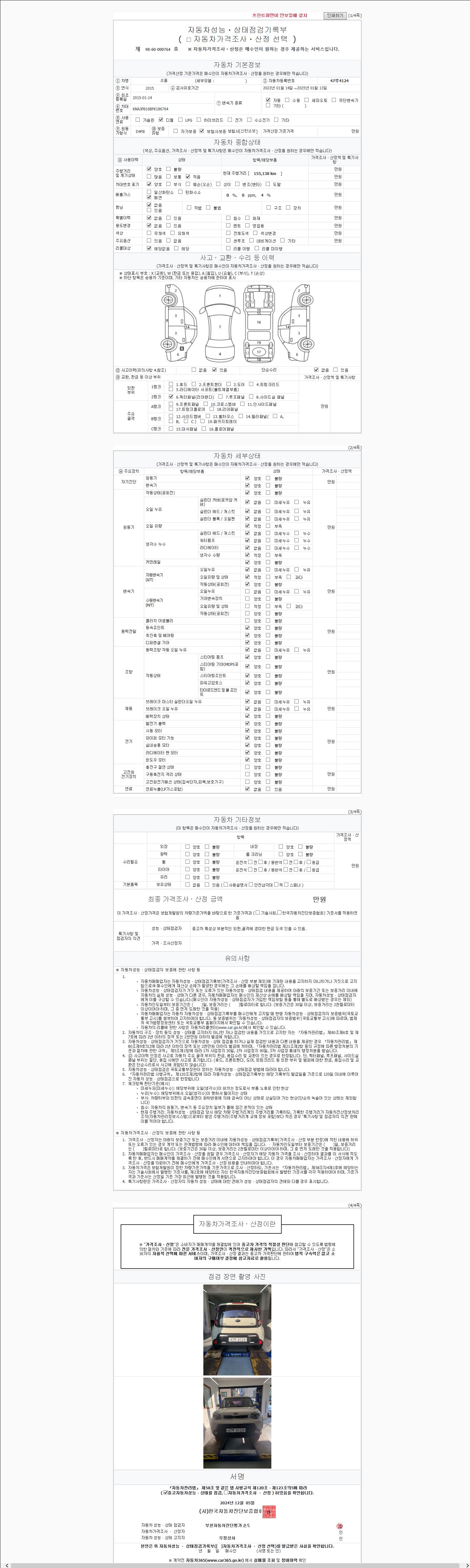 | 주행거리 | 155,133 km | 차량번호 | 47루4124 | 사고유무 | 성능기록부 참조 | 제시번호 | 제 2024224681 호 |