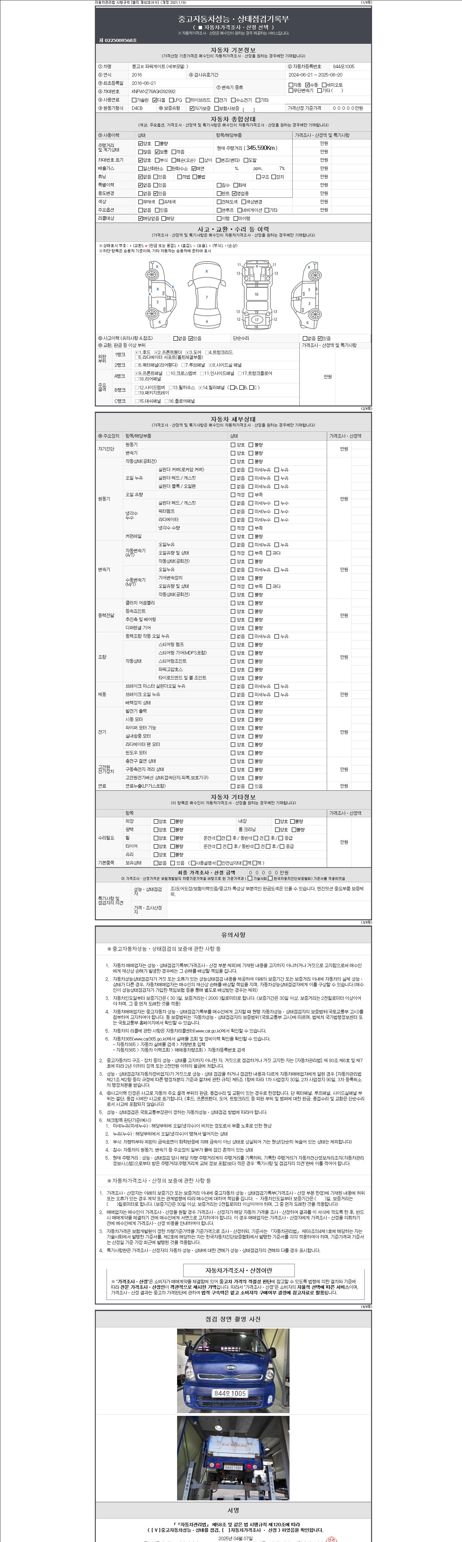 | 주행거리 | 345,590 km | 차량번호 | 844모1005 | 사고유무 | 성능기록부 참조 | 제시번호 | 제 2147483647 호 |