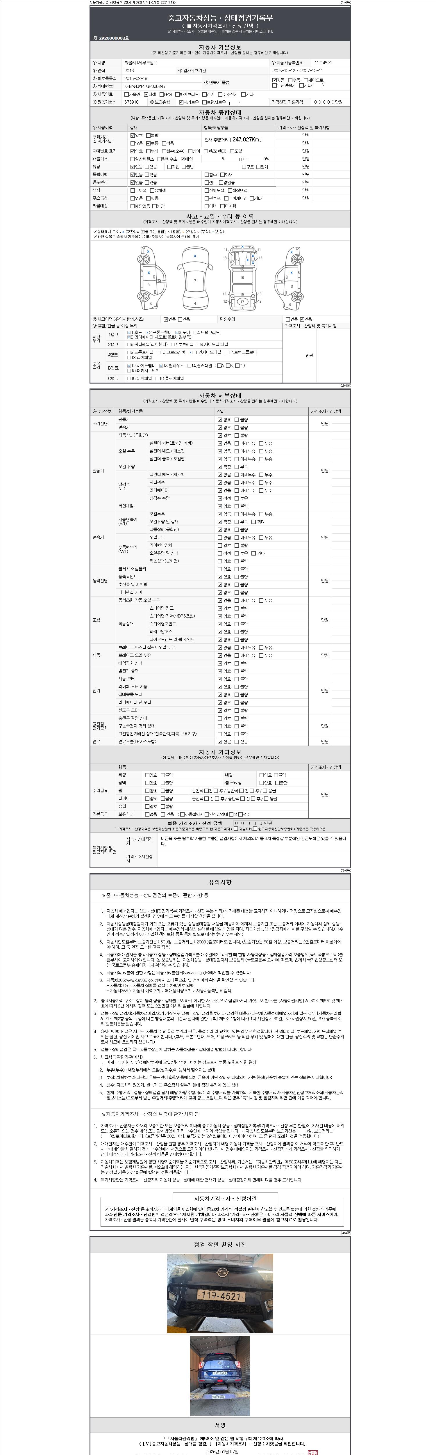 자동차관리법 시행규칙 제120조의 규정에 따라 별지 제 82호서식 《중고자동차 성능, 상태점검 기록부》를 발행한 성능, 상태점검자 및 매매자는 아래의 보증기간 또는 보증거리 이내의 중고자동차, 성능점검 기록부에 기재된 내용과 자동차의 실제 성능, 상태가 다른 경우 계약 또는 관계법령에 따라 매수인에 대하여 책임을 집니다.