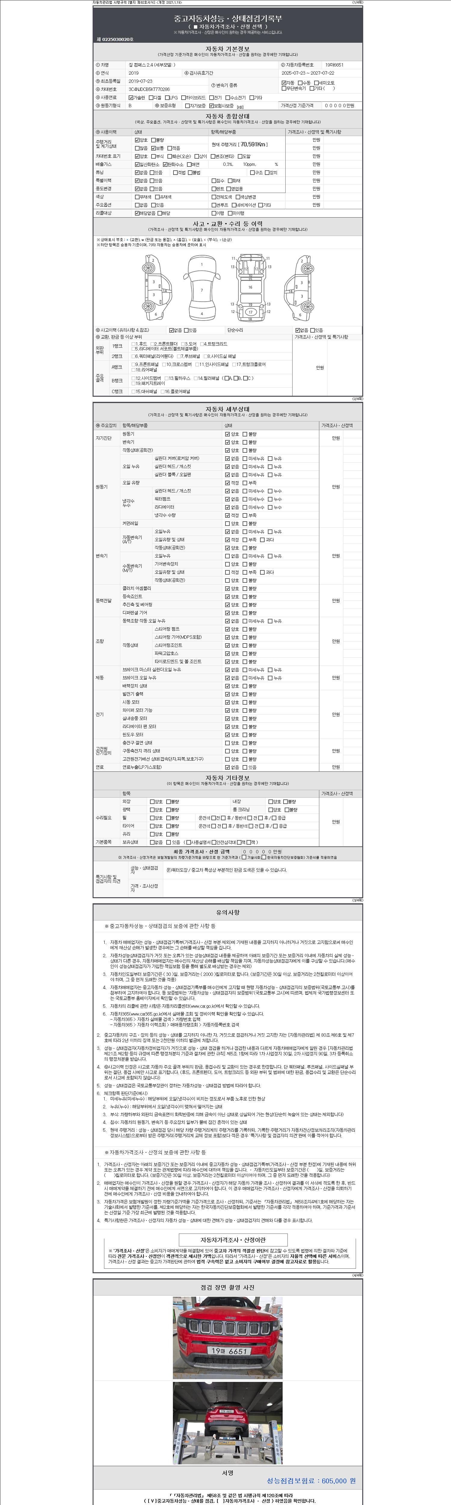 | 주행거리 | 70,574 km | 차량번호 | 19마6651 | 사고유무 | 성능기록부 참조 | 제시번호 | 제 2147483647 호 |