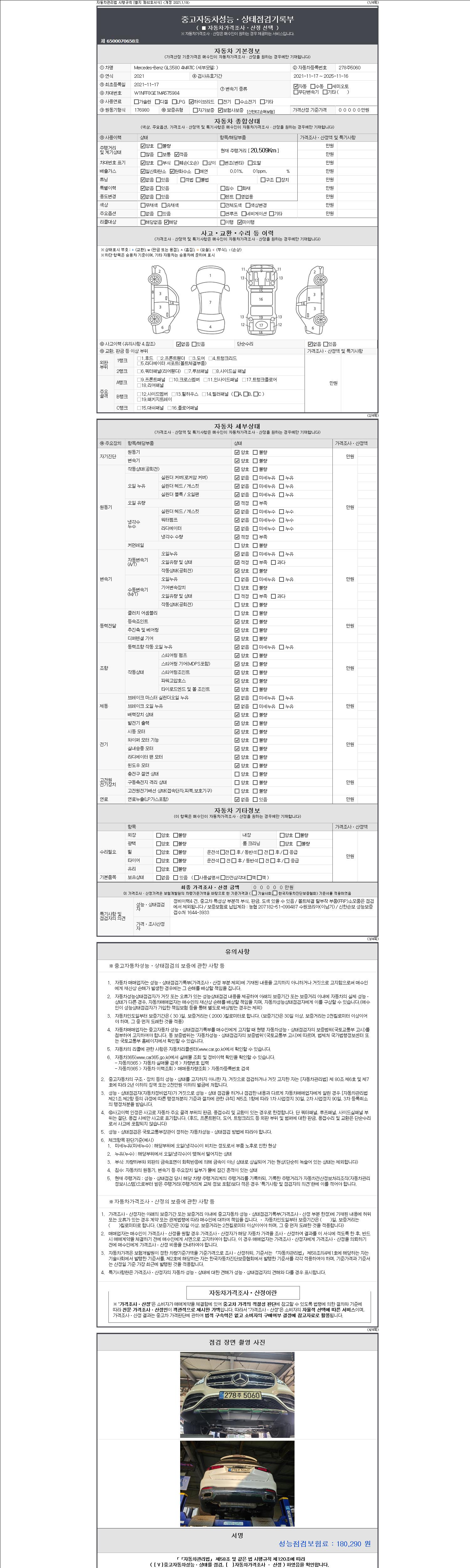 자동차관리법 시행규칙 제120조의 규정에 따라 별지 제 82호서식 《중고자동차 성능, 상태점검 기록부》를 발행한 성능, 상태점검자 및 매매자는 아래의 보증기간 또는 보증거리 이내의 중고자동차, 성능점검 기록부에 기재된 내용과 자동차의 실제 성능, 상태가 다른 경우 계약 또는 관계법령에 따라 매수인에 대하여 책임을 집니다.