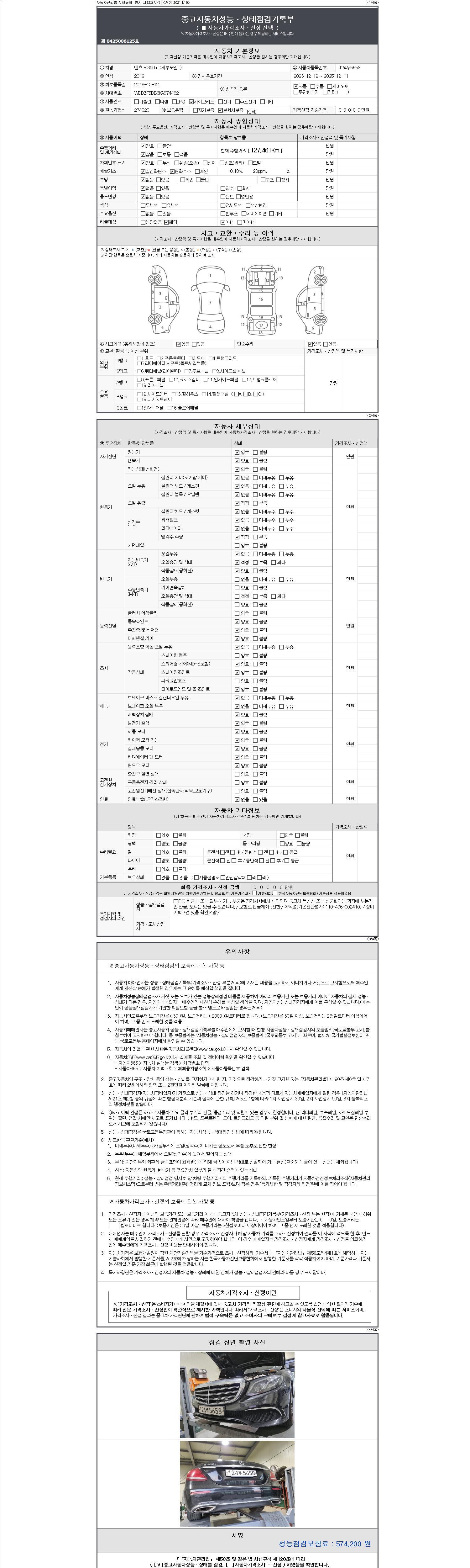 | 주행거리 | 127,461 km | 차량번호 | 124무5658 | 사고유무 | 성능기록부 참조 | 제시번호 | 제 2147483647 호 |
