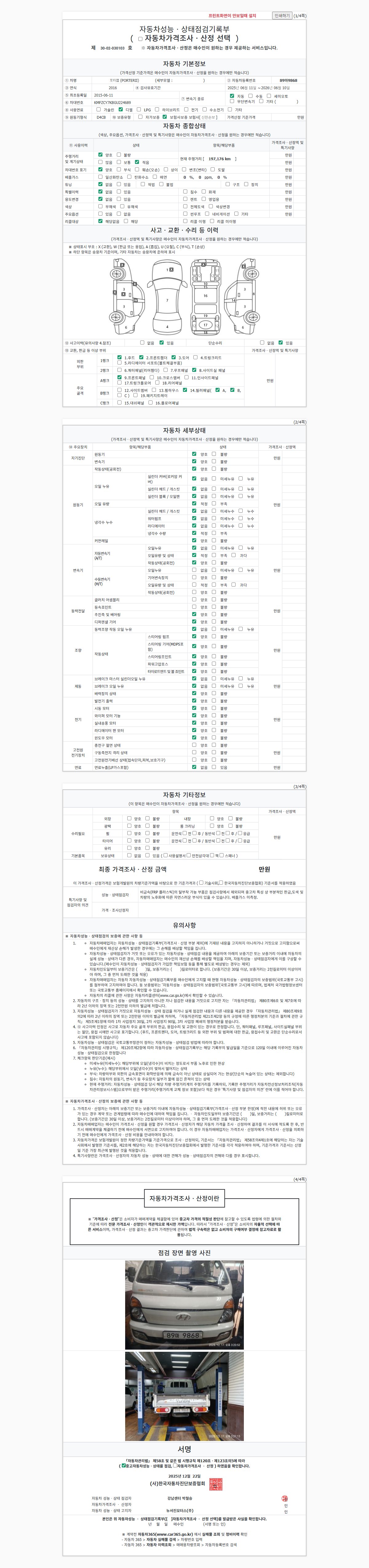 | 주행거리 | 197,176 km | 차량번호 | 89마9868 | 사고유무 | 성능기록부 참조 | 제시번호 | 제 2026000704 호 |
