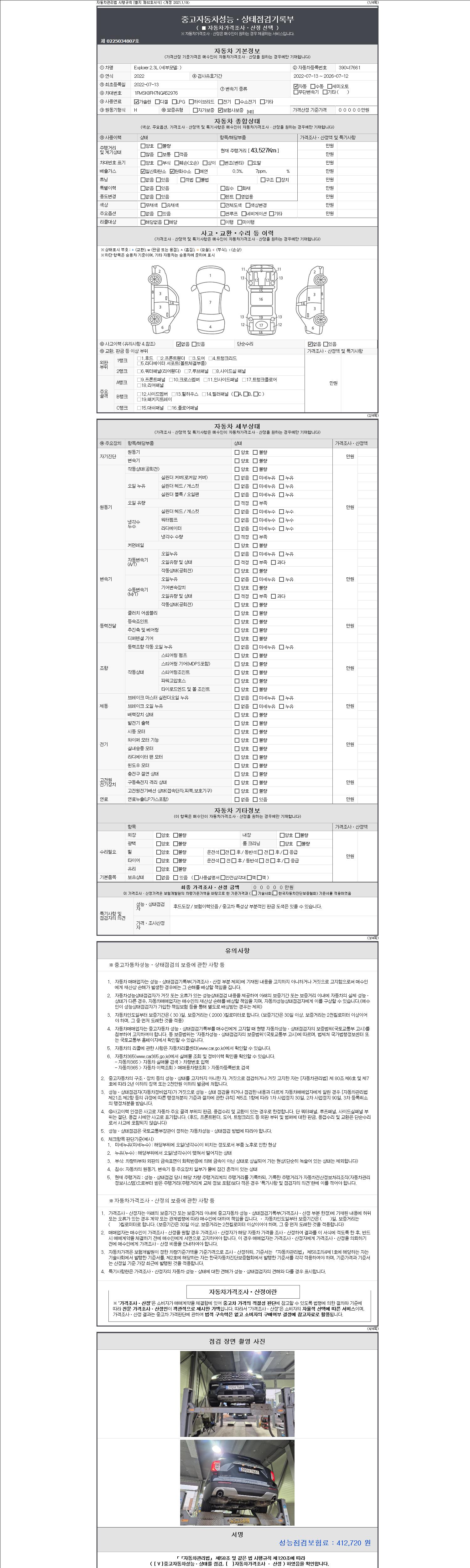 | 주행거리 | 43,000 km | 차량번호 | 390너7661 | 사고유무 | 성능기록부 참조 | 제시번호 | 제 2147483647 호 |