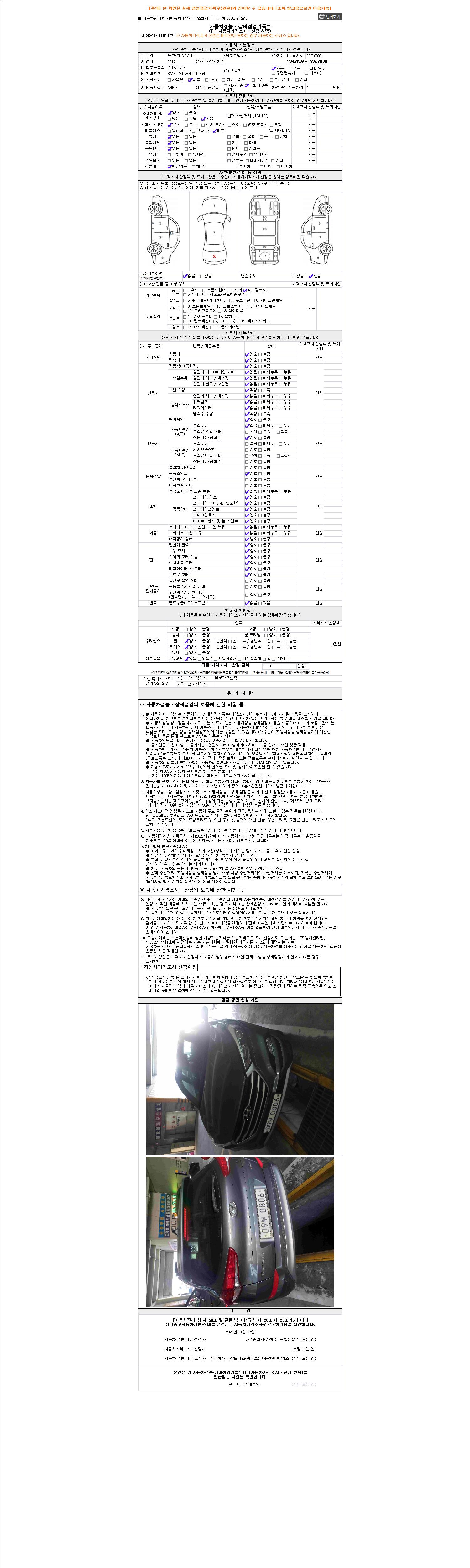 자동차관리법 시행규칙 제120조의 규정에 따라 별지 제 82호서식 《중고자동차 성능, 상태점검 기록부》를 발행한 성능, 상태점검자 및 매매자는 아래의 보증기간 또는 보증거리 이내의 중고자동차, 성능점검 기록부에 기재된 내용과 자동차의 실제 성능, 상태가 다른 경우 계약 또는 관계법령에 따라 매수인에 대하여 책임을 집니다.