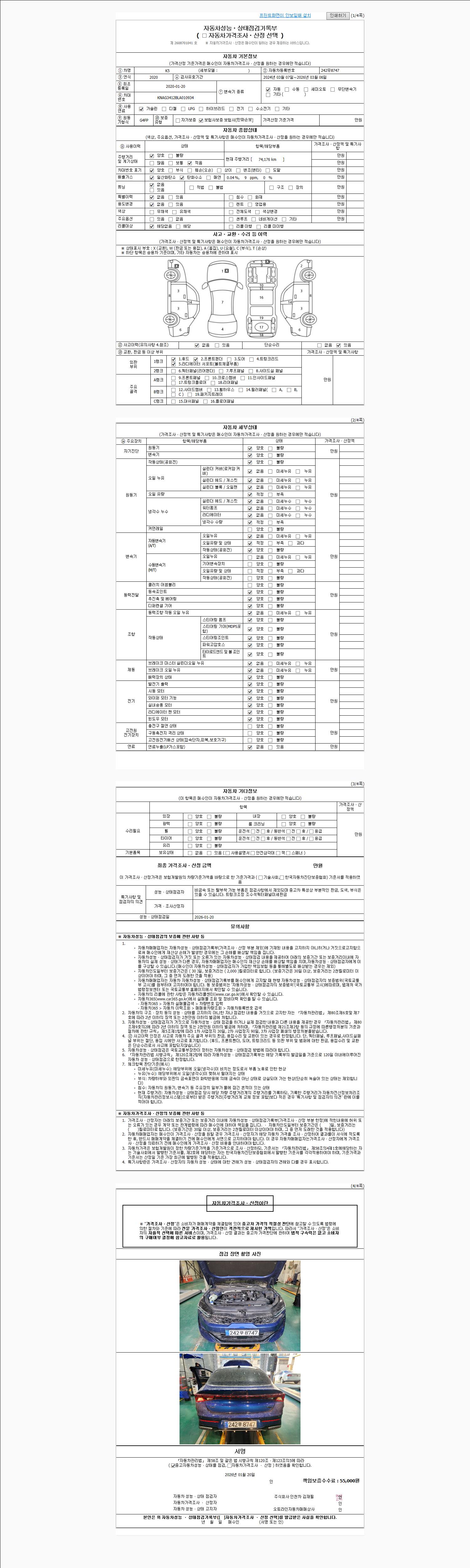 | 주행거리 | 74,176 km | 차량번호 | 242무8747 | 사고유무 | 성능기록부 참조 | 제시번호 | 제 2026003416 호 |