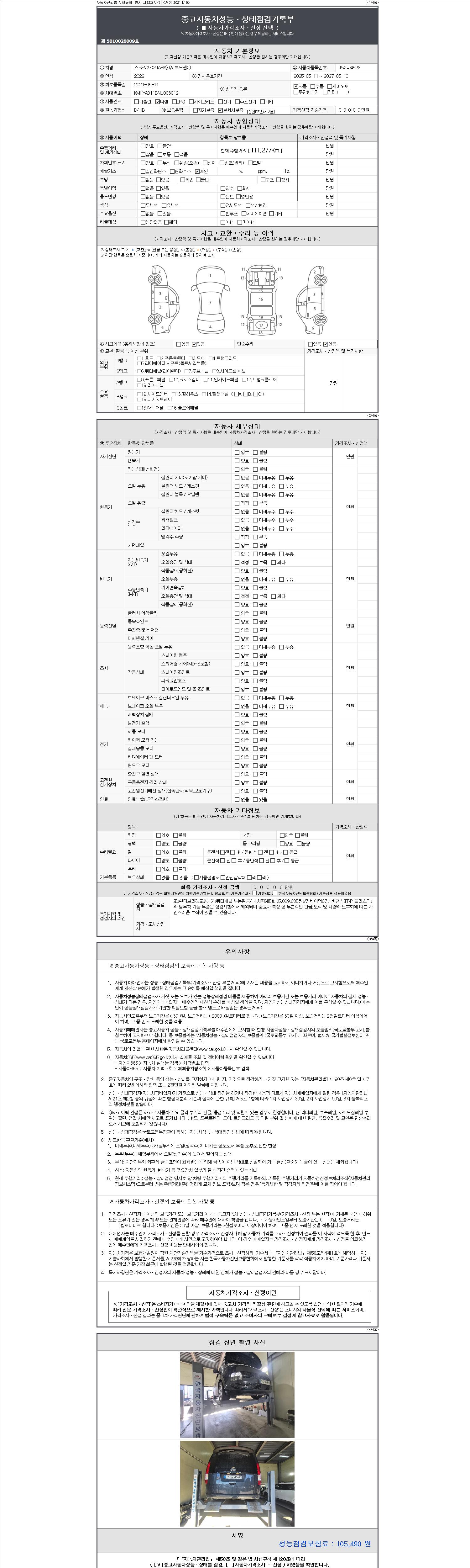 자동차관리법 시행규칙 제120조의 규정에 따라 별지 제 82호서식 《중고자동차 성능, 상태점검 기록부》를 발행한 성능, 상태점검자 및 매매자는 아래의 보증기간 또는 보증거리 이내의 중고자동차, 성능점검 기록부에 기재된 내용과 자동차의 실제 성능, 상태가 다른 경우 계약 또는 관계법령에 따라 매수인에 대하여 책임을 집니다.