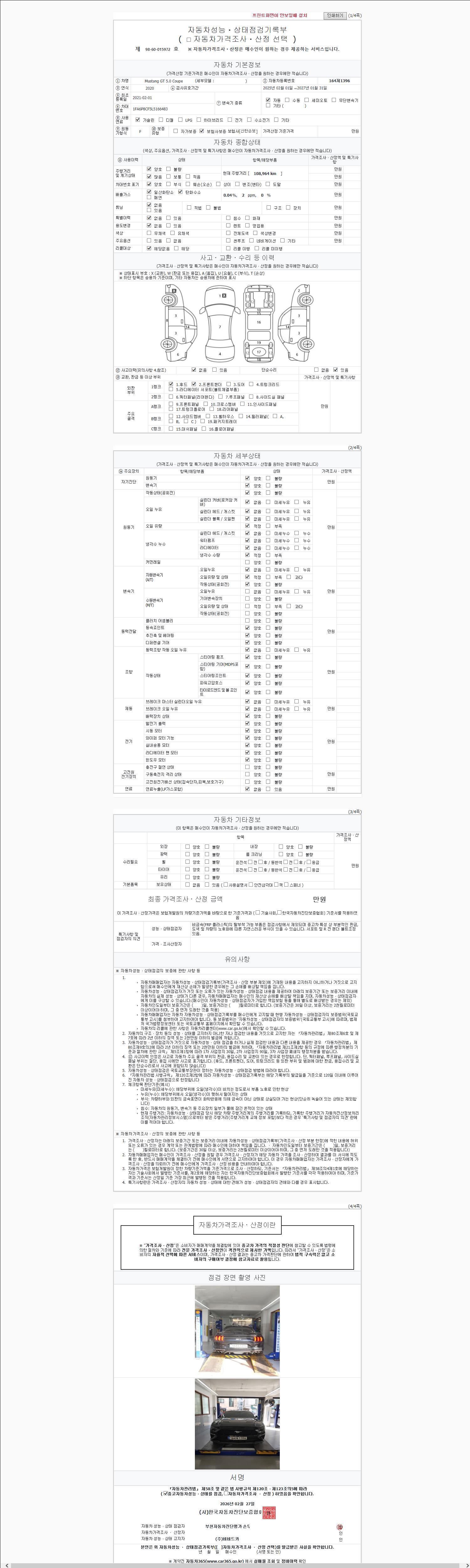 | 주행거리 | 108,962 km | 차량번호 | 164저1396 | 사고유무 | 성능기록부 참조 | 제시번호 | 제 2026036442 호 |