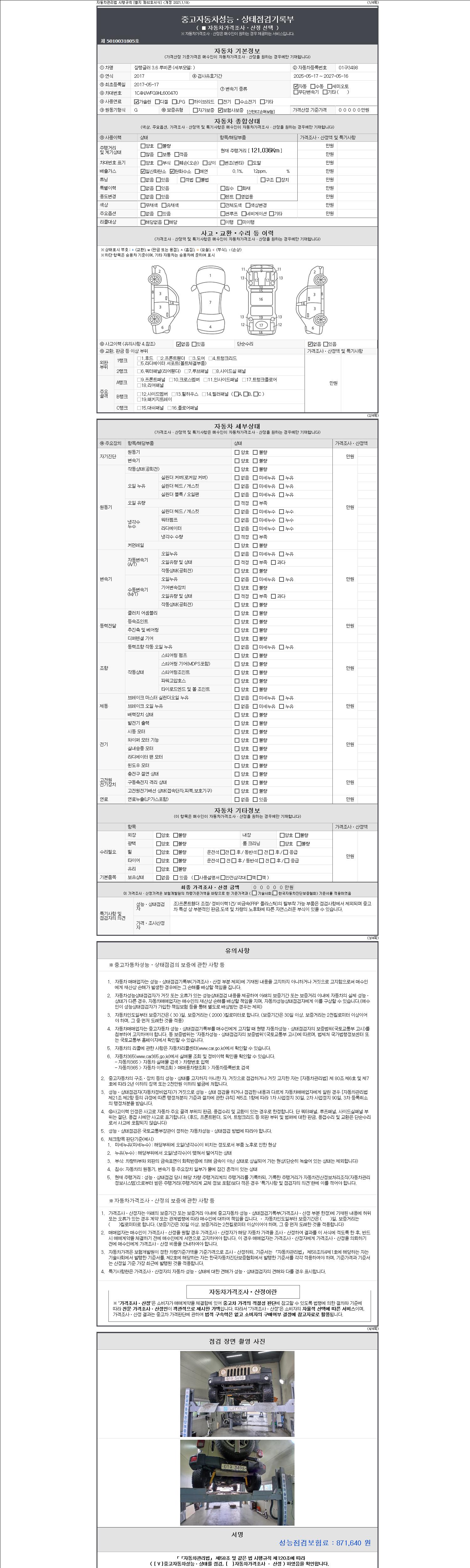 | 주행거리 | 121,035 km | 차량번호 | 01구3498 | 사고유무 | 성능기록부 참조 | 제시번호 | 제 2147483647 호 |