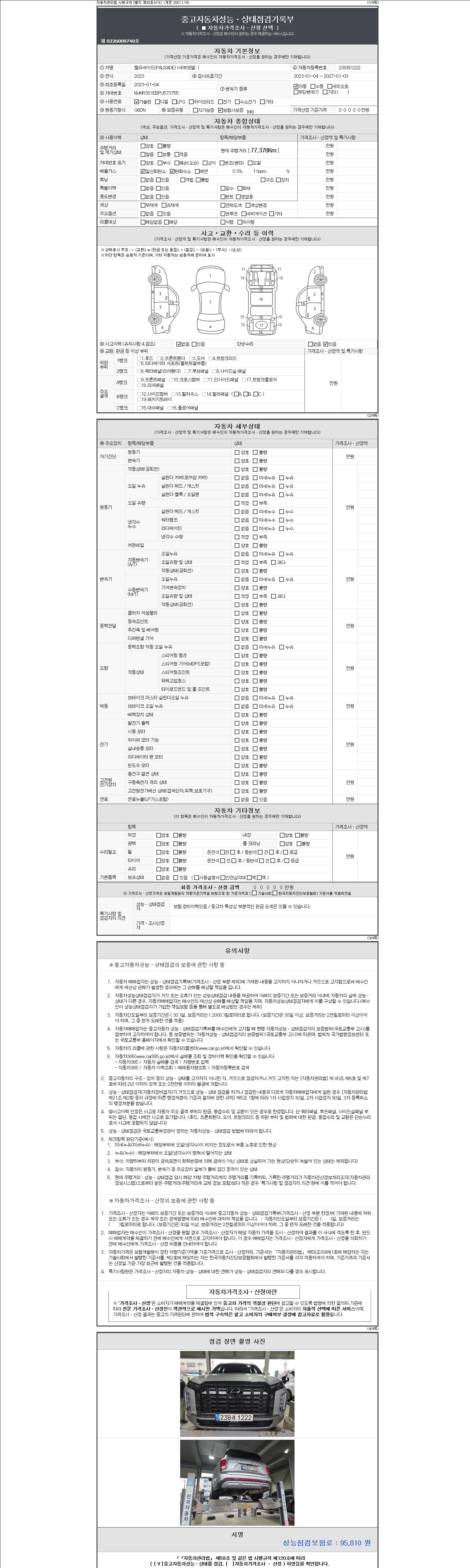 자동차관리법 시행규칙 제120조의 규정에 따라 별지 제 82호서식 《중고자동차 성능, 상태점검 기록부》를 발행한 성능, 상태점검자 및 매매자는 아래의 보증기간 또는 보증거리 이내의 중고자동차, 성능점검 기록부에 기재된 내용과 자동차의 실제 성능, 상태가 다른 경우 계약 또는 관계법령에 따라 매수인에 대하여 책임을 집니다.