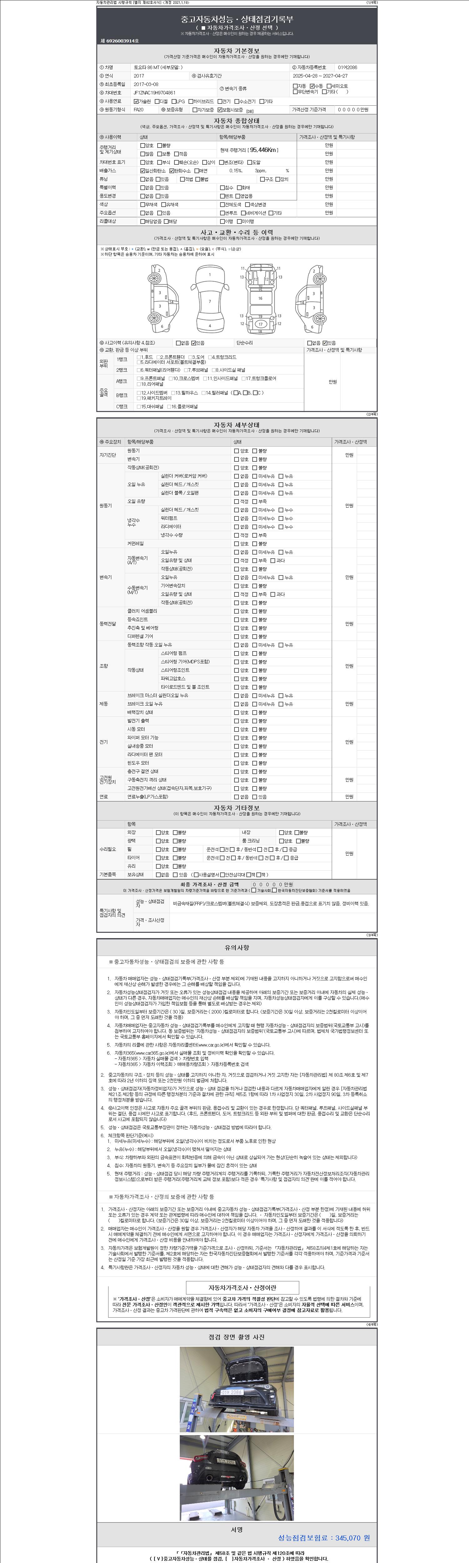 자동차관리법 시행규칙 제120조의 규정에 따라 별지 제 82호서식 《중고자동차 성능, 상태점검 기록부》를 발행한 성능, 상태점검자 및 매매자는 아래의 보증기간 또는 보증거리 이내의 중고자동차, 성능점검 기록부에 기재된 내용과 자동차의 실제 성능, 상태가 다른 경우 계약 또는 관계법령에 따라 매수인에 대하여 책임을 집니다.